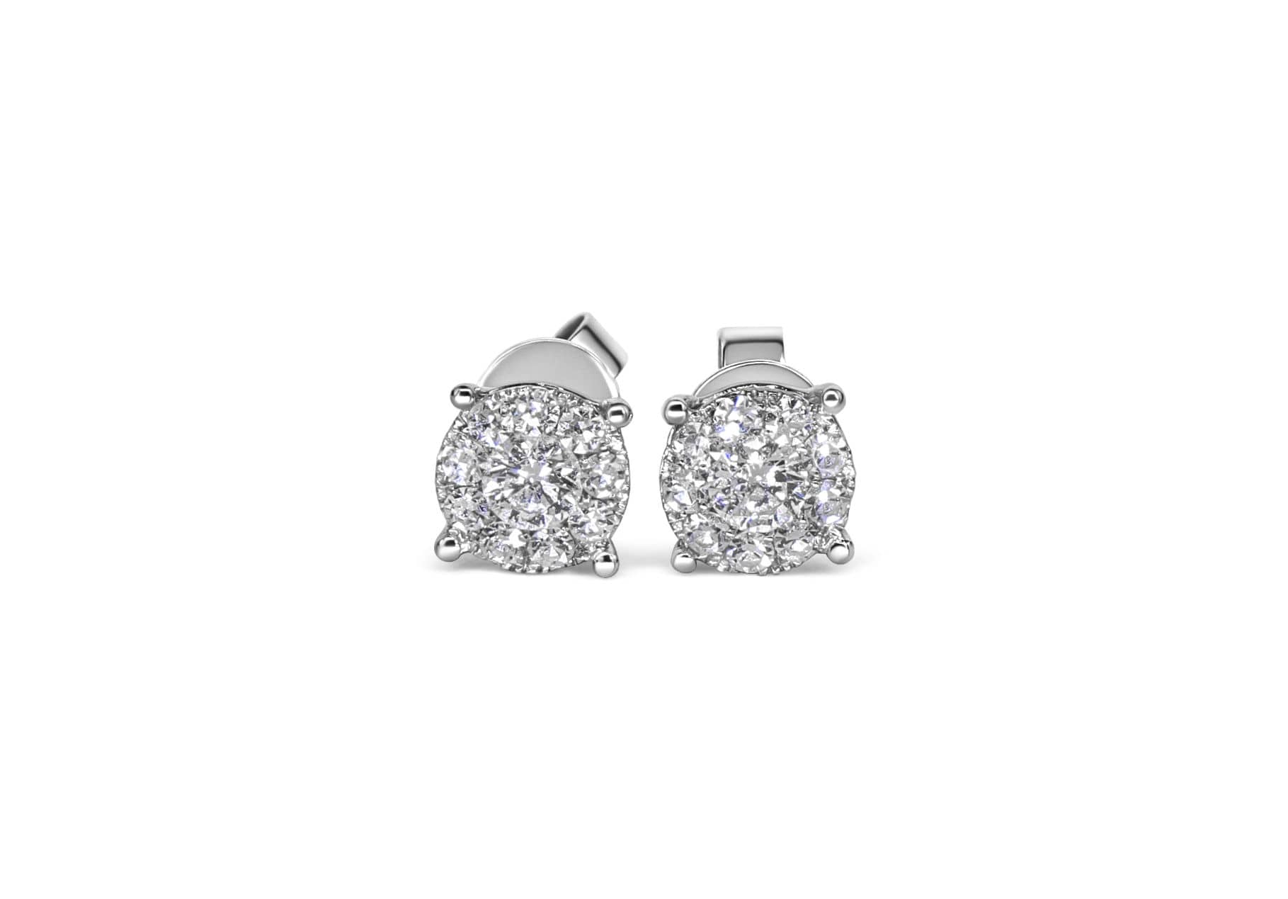 Round brilliant cut diamond and 18K white gold cluster stud earrings. Timeless, easy to wear, and matches with any outfit.
