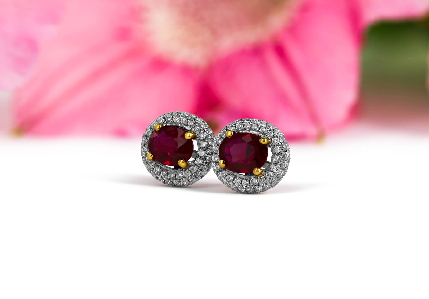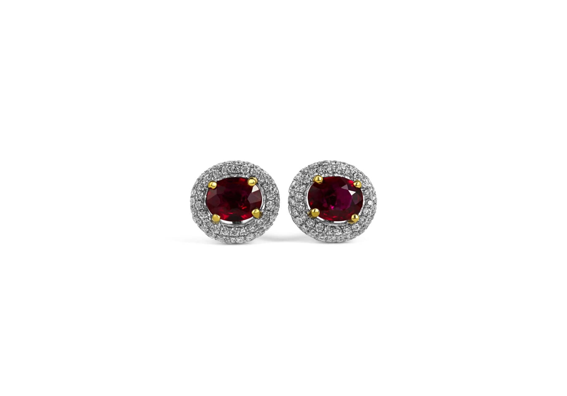 Ruby and diamond stud earrings. Two perfectly matched natural rubies surrounded by pave setting diamond halos.