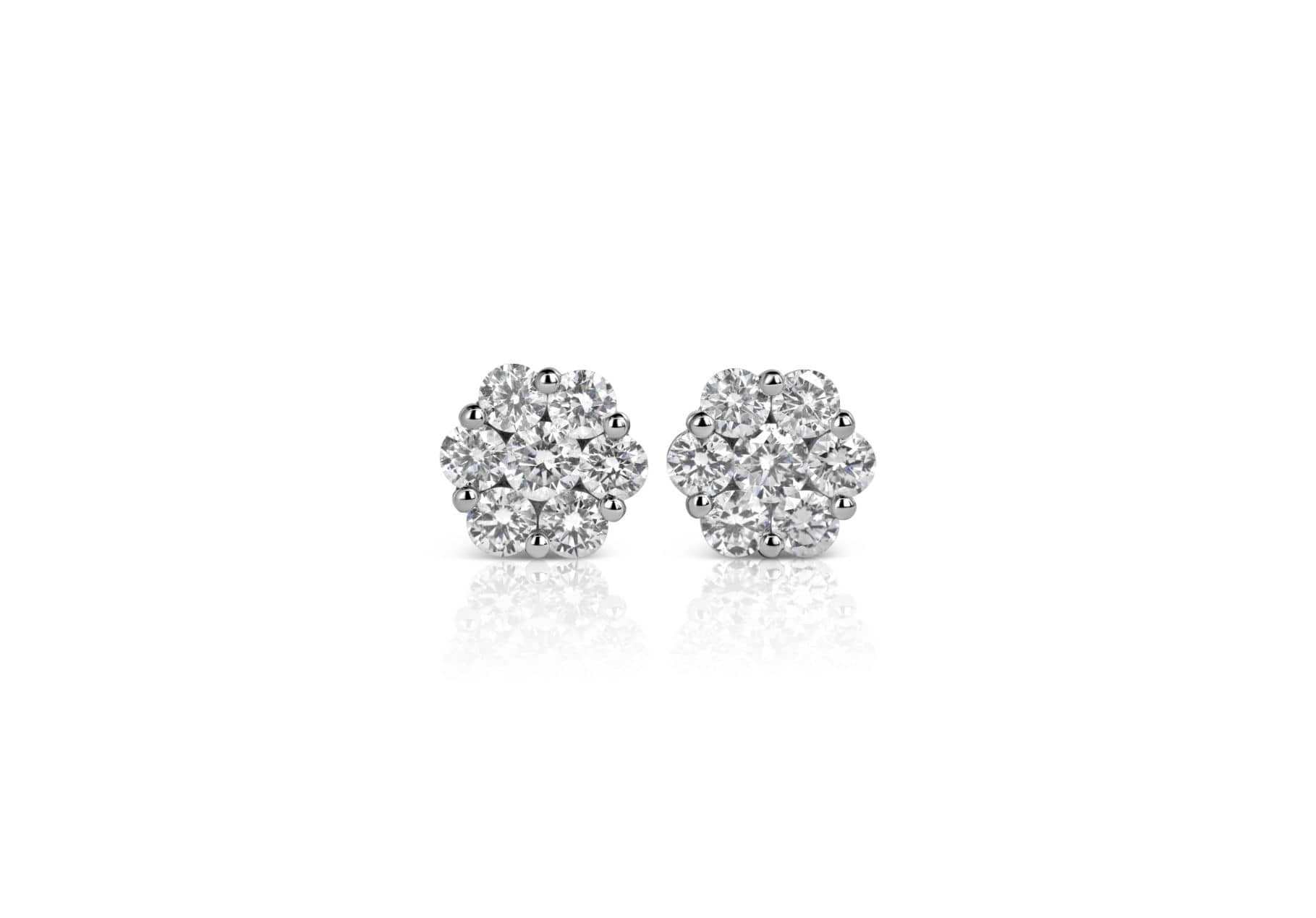 Round brilliant cut diamond and 18K white gold cluster set stud earrings. Timeless, easy to wear, and matches with any outfit.
