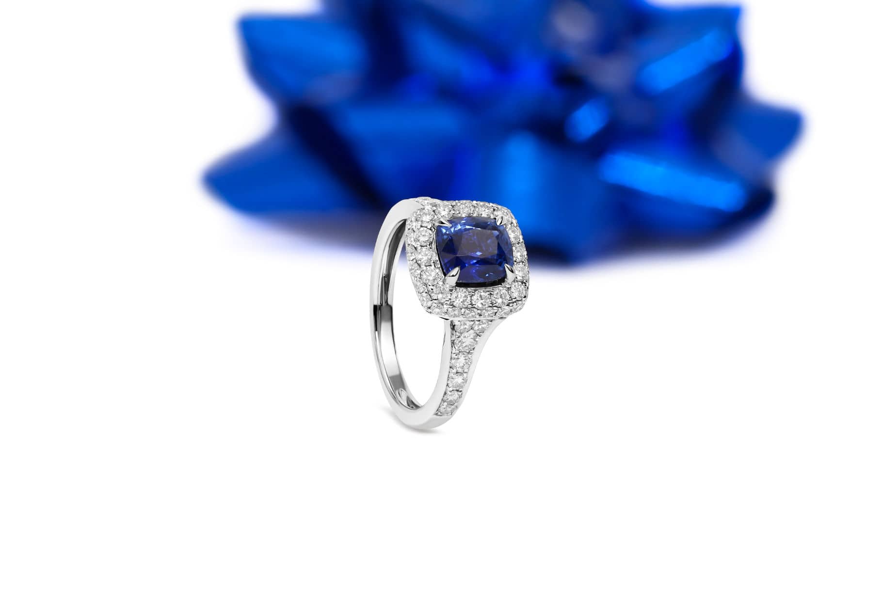 A halo design engagement ring set with a stunning natural cushion cut blue sapphire in the centre.