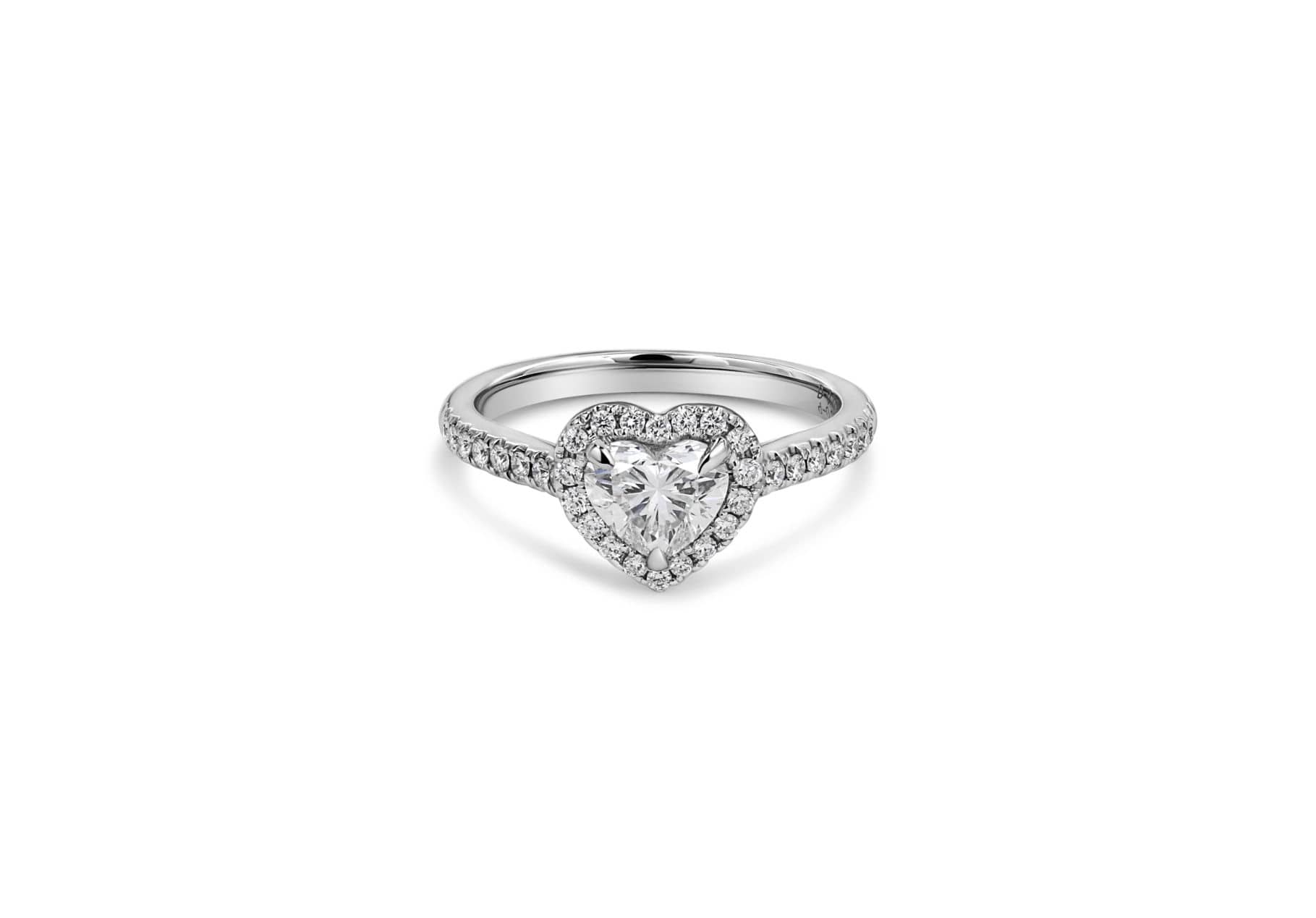 A halo design engagement ring set with a heart shape diamond in the centre.