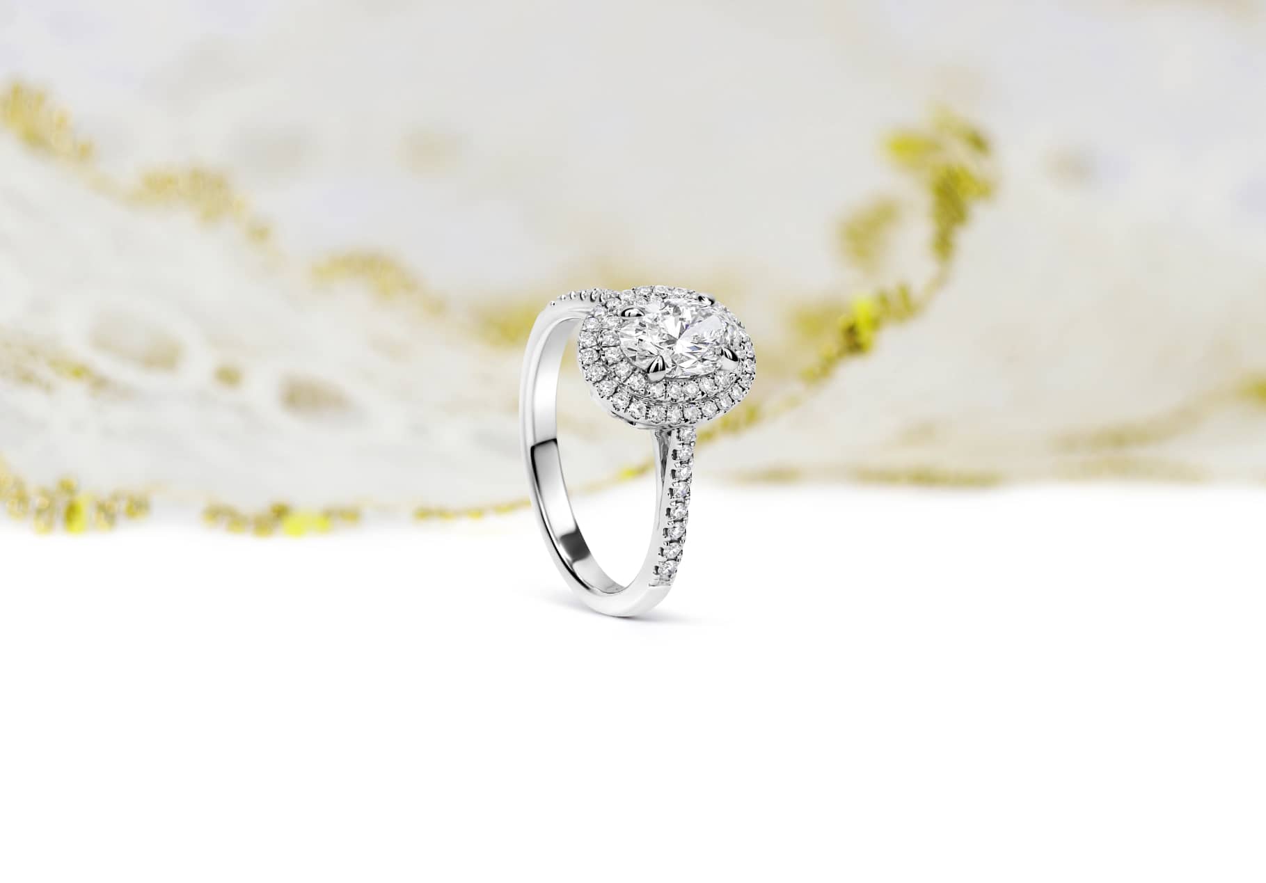 A beautiful double halo design engagement ring with an oval shape diamond.