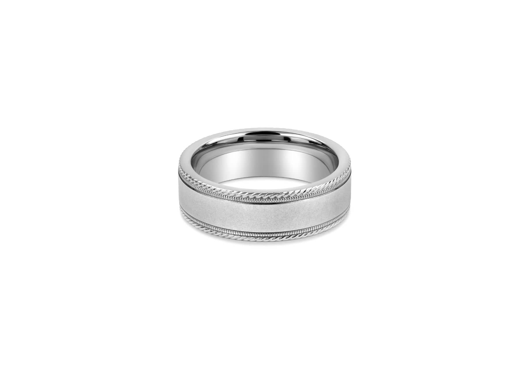 A classy and unique men's wedding band with fine rope milgrain design on the edges and sandblast finish in the centre.