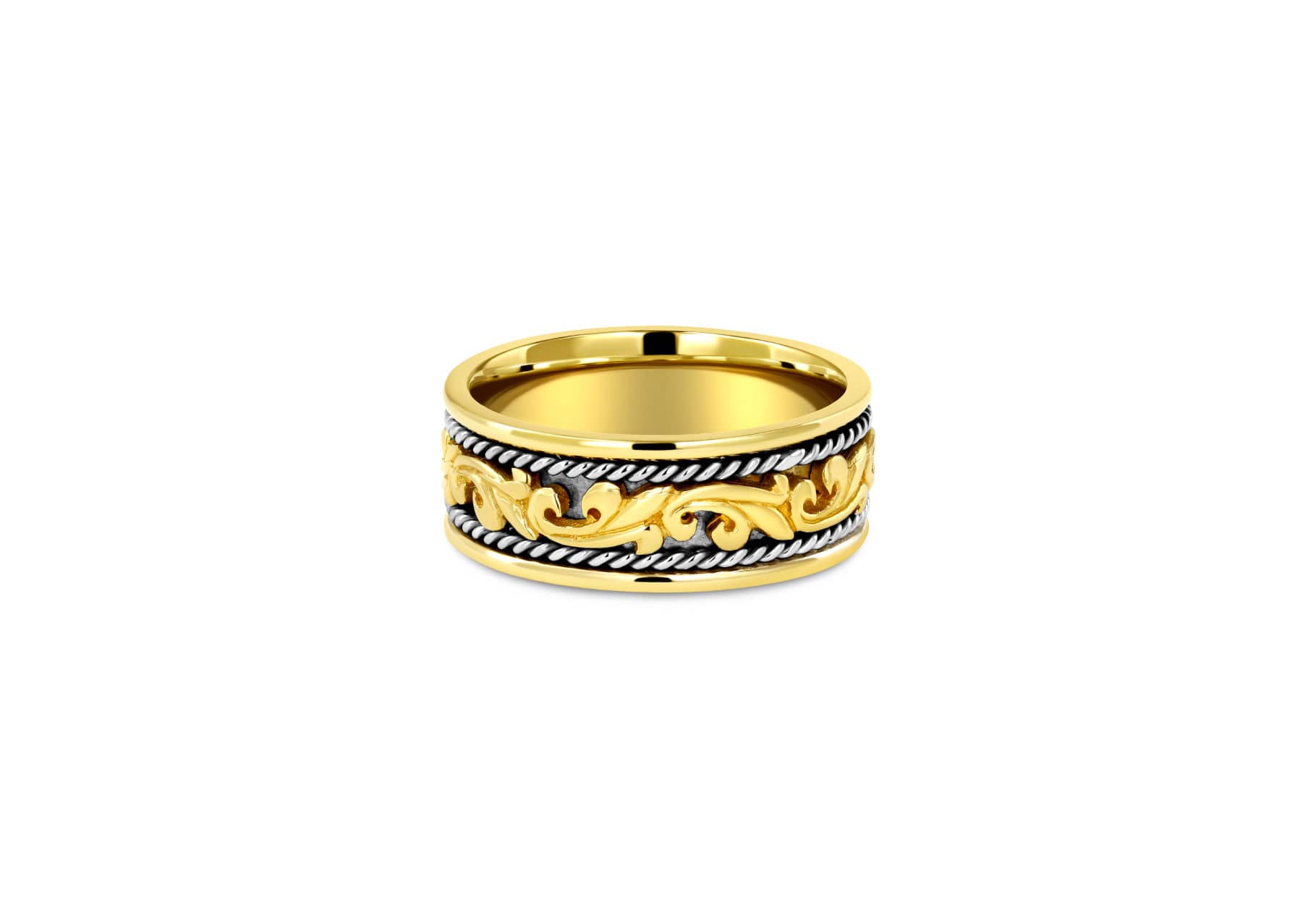 A hand woven and assembled men's wedding band. The floral and rope design goes all around the band.