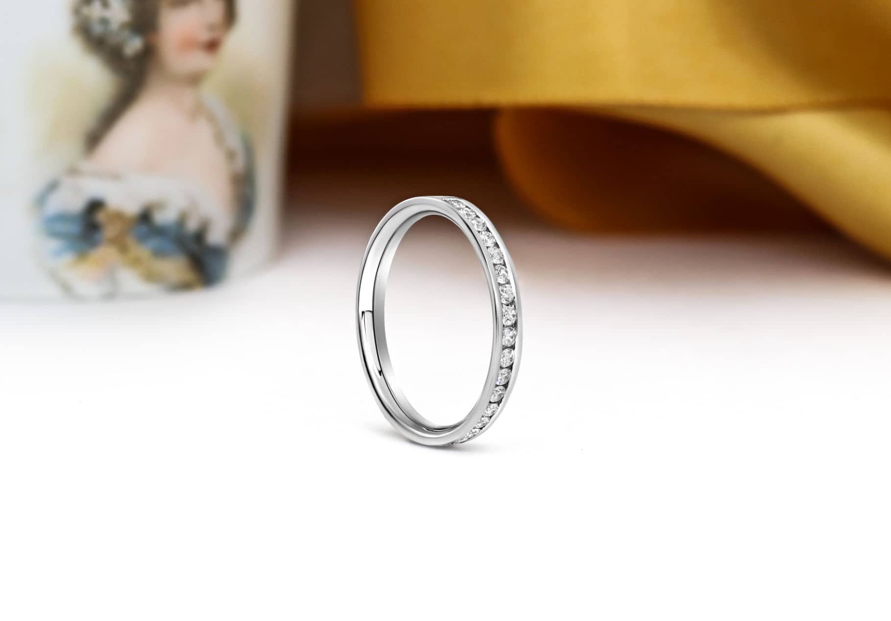 Channel set, flat top, uniform width, round brilliant cut diamond band.