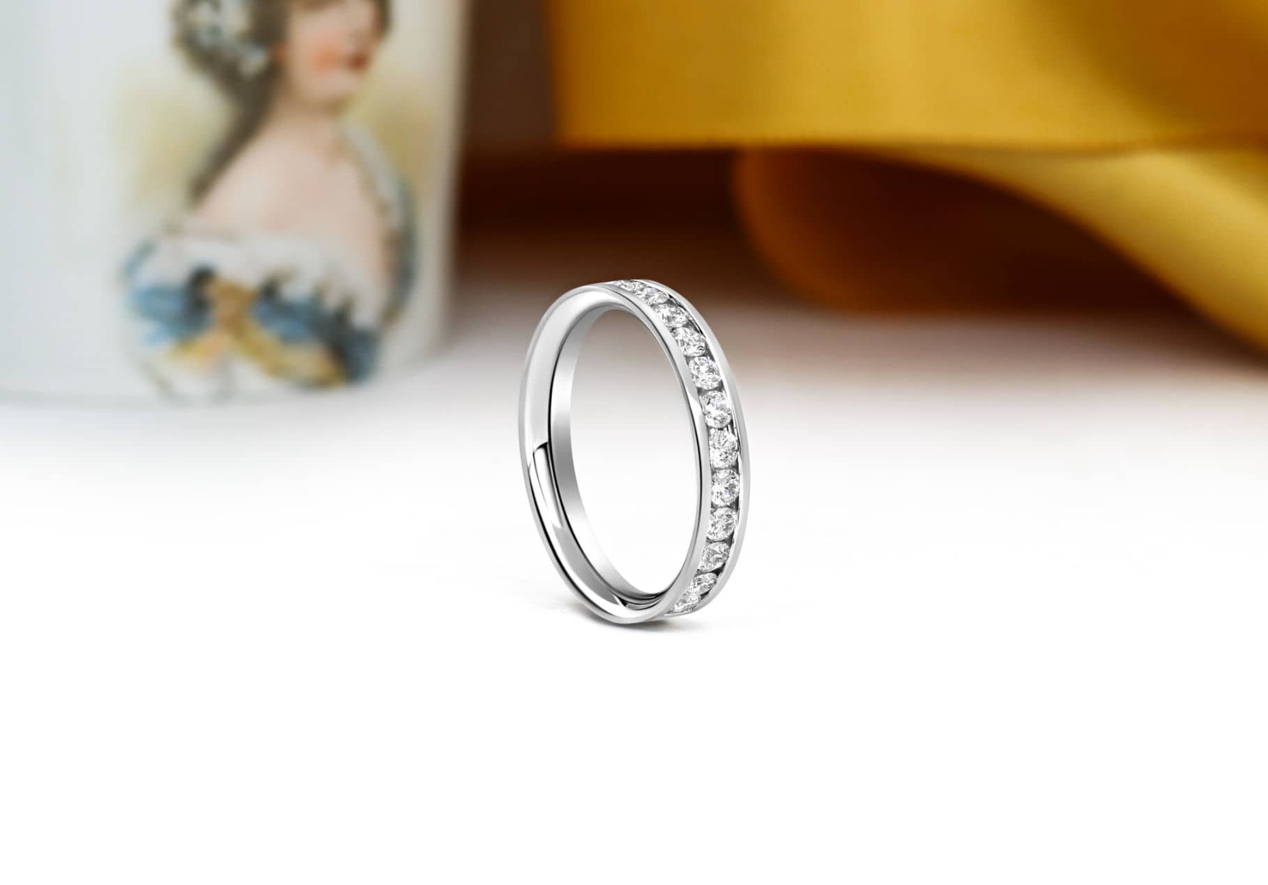 Channel set, flat top, uniform width, round brilliant cut diamond band.