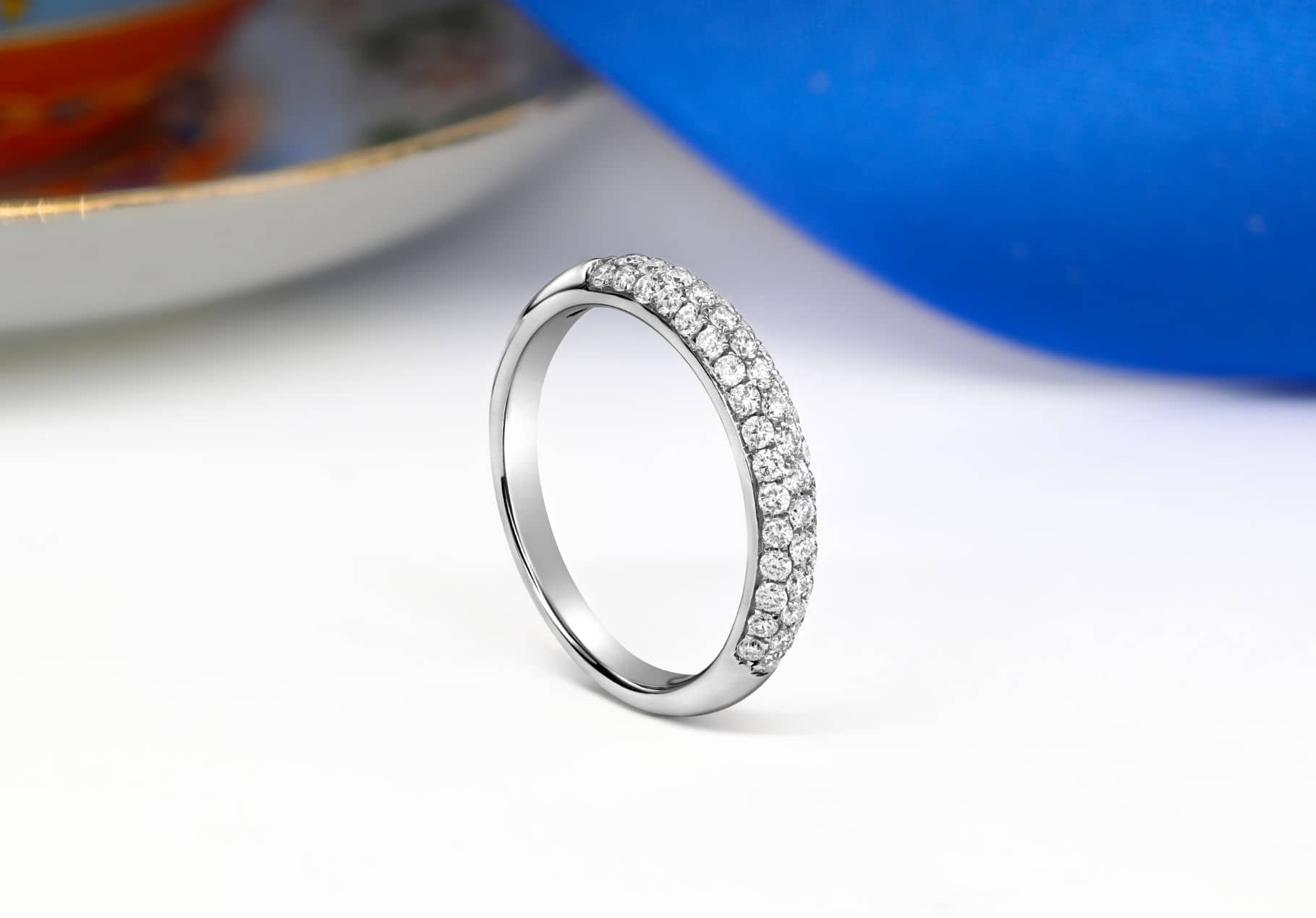 Dome shape, three rows pave-set, diamond band.