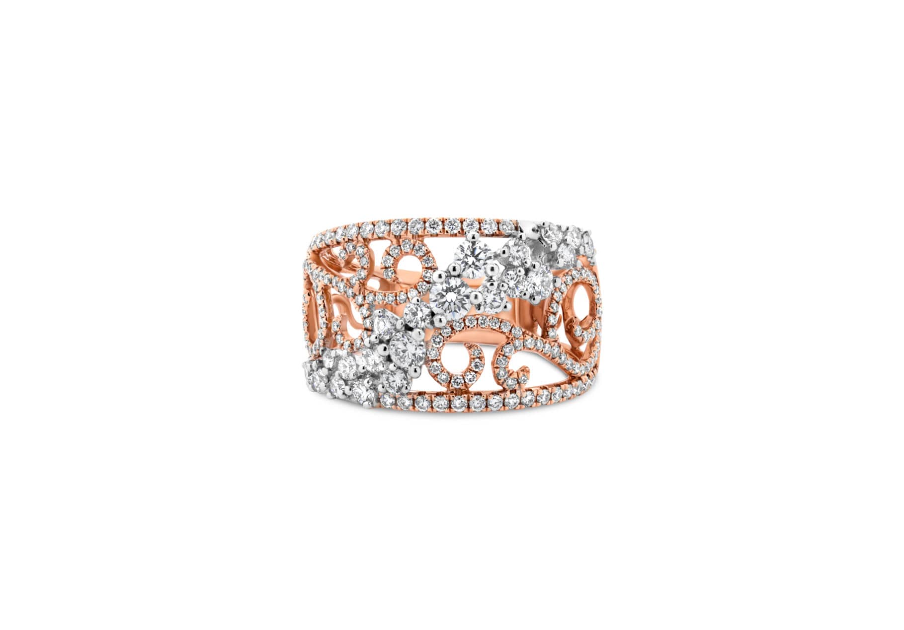 A beautiful two-color wide ring. A row of different size diamonds stretches from one side to another, surrounded by a scroll design on the sides.